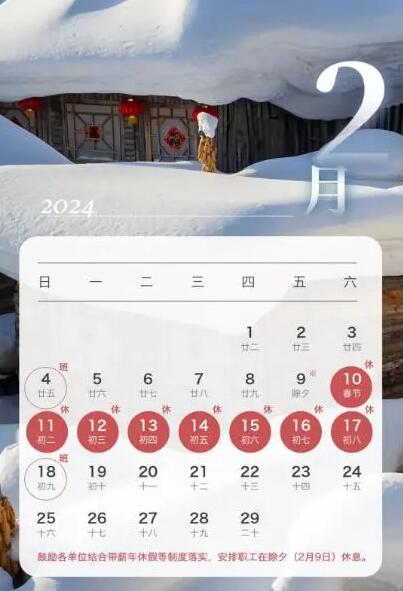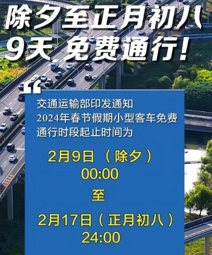 根據(jù)交通運輸部關(guān)于優(yōu)化2024年春節(jié)假期收費公路免收小型客車通行費時段的通知,2024年春節(jié)假期小型客車免費通行時段起止時間為2月9日(除夕)00:00至2月17日(正月初八)24:00。