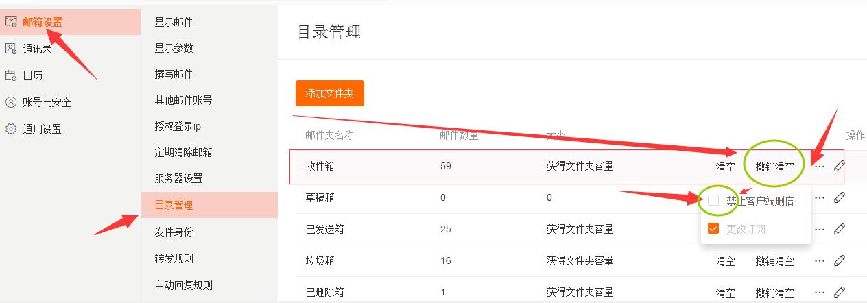 郵箱設(shè)置 > 目錄管理 > 收件箱 > 撤銷清空 > 勾選“禁止客戶端刪信”,如下圖