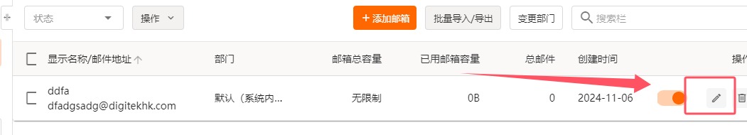 2、在“郵箱賬號(hào)”,右側(cè)列表中展示所有添加完成的郵箱用戶??梢孕薷南鄳?yīng)賬號(hào)密碼,刪除賬號(hào)。設(shè)置此郵箱是否支持客戶端收發(fā)。