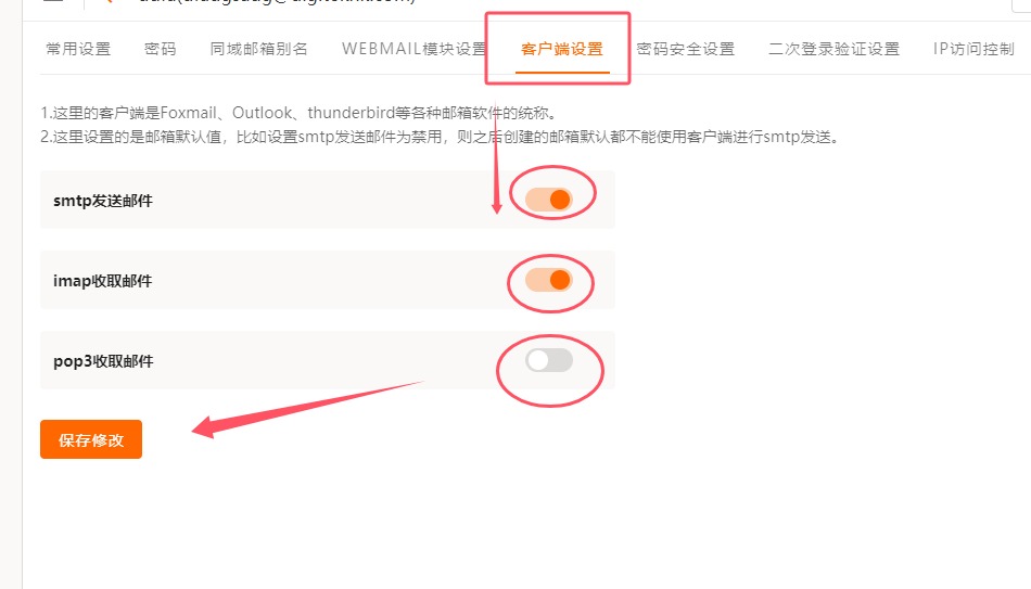 點(diǎn)擊每個(gè)郵箱后的修改,進(jìn)入后在“客戶端設(shè)置”里點(diǎn)開下面3項(xiàng)后,保存。
